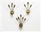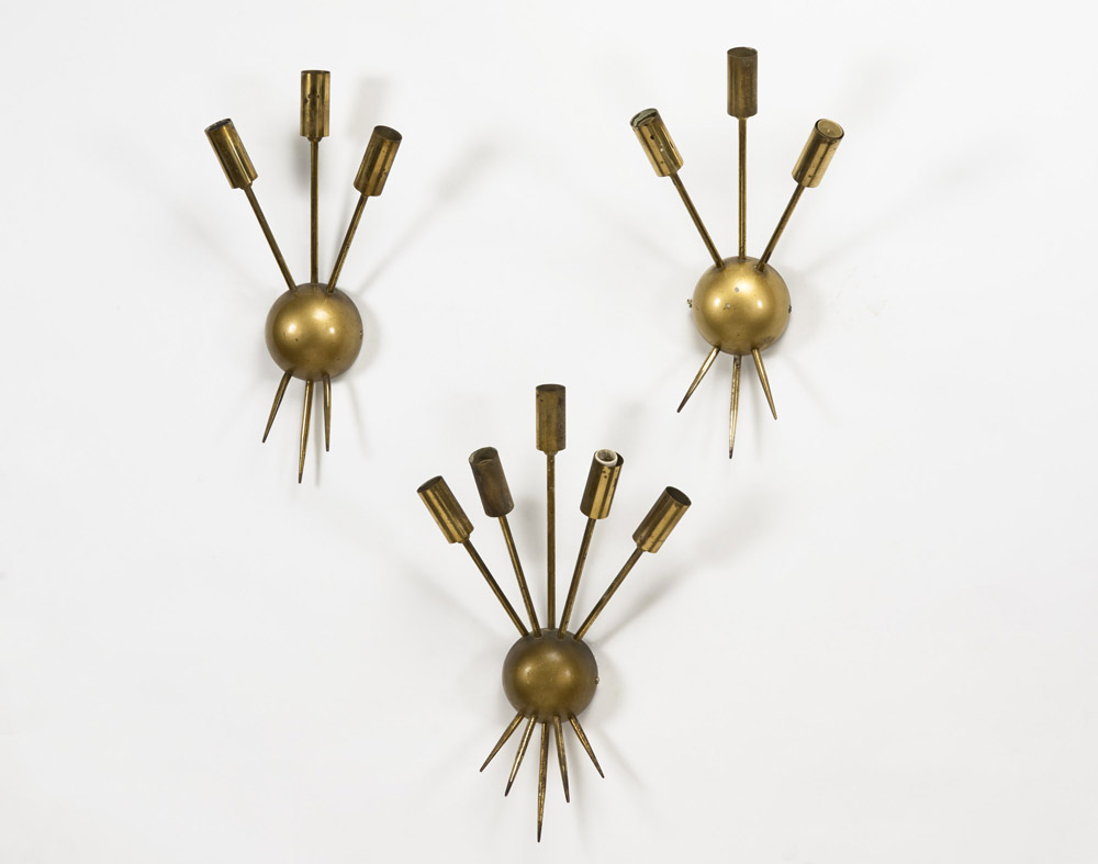 Coppia di appliques tipo "sputnik" a tre luci in fusione di alluminio verniciata e ottone unite ad una analoga a cinque luci. Produzione italiana anni 50 ( h cm 36 ca.) (lievi difetti)