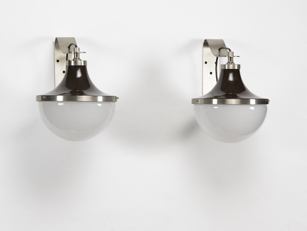 Mazza Sergio (Milano 1931) - Coppia di lampade da parete modello "Pi". Produzione Artemide, Milano 1960 ca. Ottone nichelato, alluminio stampato laccato bruno, vetro incamiciato lattimo. (h cm 26, d cm 25)