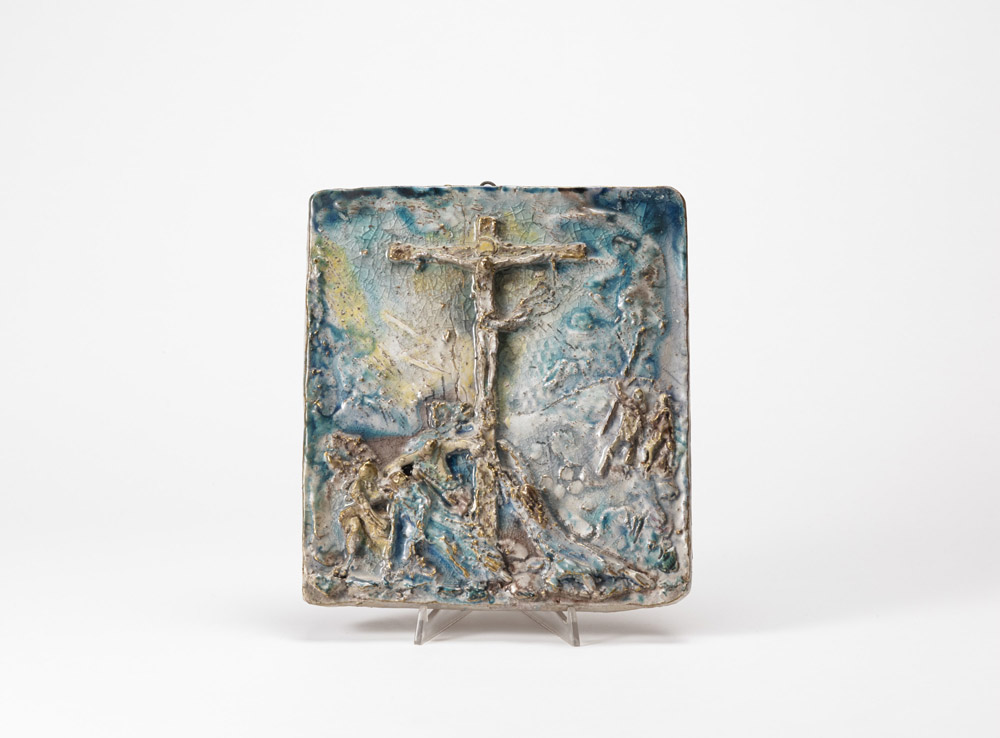 Placca in terracotta smaltata in policromia e dorature con scena della "Crocefissione" . Manifattura italiana anni 50 ca.(cm 28x26)