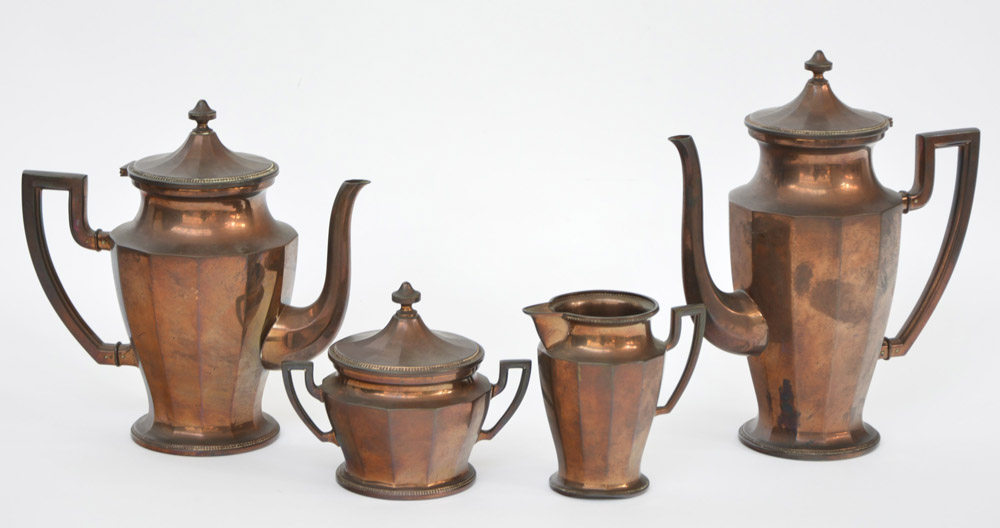 Servizio in rame composto da caffettiera, teiera, zuccheriera e lattiera, anni 30 ca, punzoni alla base