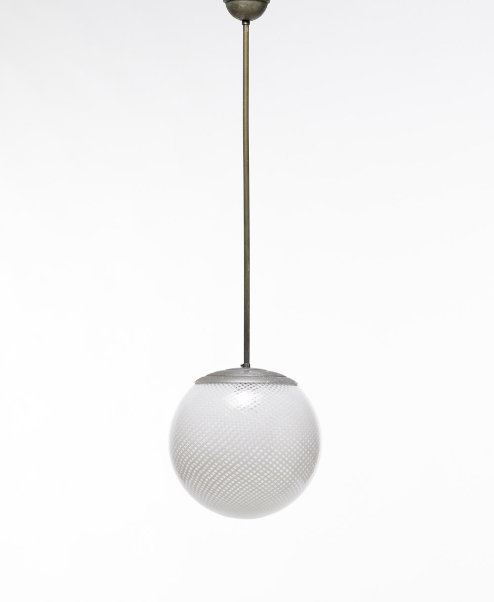 Venin (attribuito) Lampada a sospensione con paralume a globo in vetro soffiato a reticello bianco, asta in metallo cromato. Murano, anni 30 del secolo XX (d cm 25) Disegno compatibile con la tav. 142 del catalogo blu Bibliografia: F. De Boni, I vetri Venini. La storia, gli artisti, le tecniche, Allemandi, Torino 2007, tav. 142