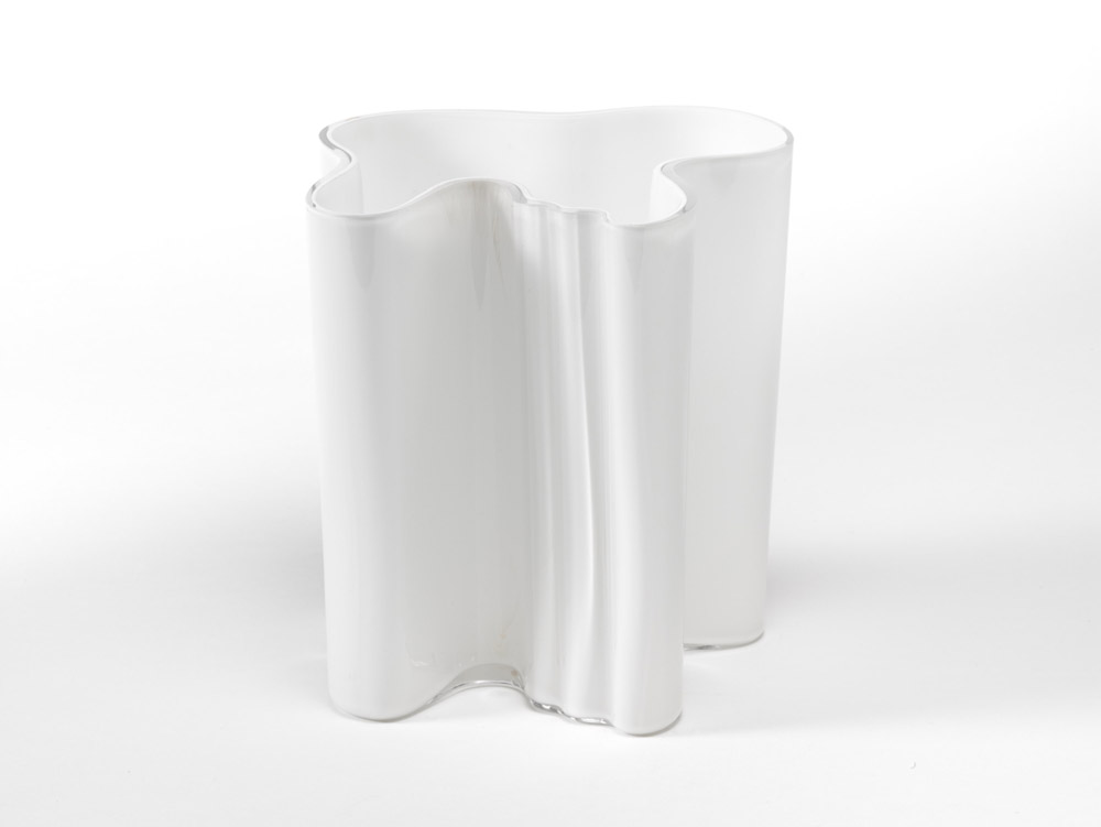 Alvar Aalto (1898 - 1976) - Vaso modello "7071", produzione Iittala, Finlandia anni 70. Vetro incamiciato trasparente e bianco, prodotto a stampo. Firmato e numerato a punta sotto la base. (h cm 20,5)