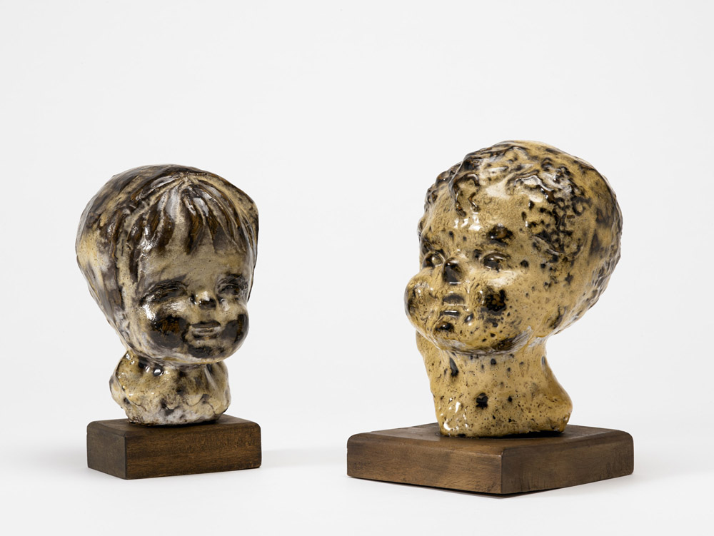 Lotto di due teste di fanciullo in ceramica invetriata montate su base in legno. Italia, anni 50 (cm h 25 e 28)