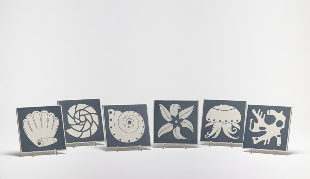 Giovanni Gariboldi (1908 - 1971) - Gruppo di sei piastrelle in ceramica smaltate in bianco e blu con decori raffiguranti flora e fauna marina. Manifattura Richard Ginori, anni 50 (cm 15,5x15,5)