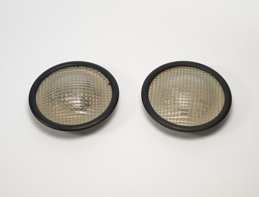 Stilnovo. Coppia di plafoniere. Milano, anni 70. Vetro stampato, metallo verniciato bianco e bordo in metallo verniciato nero. (d cm 47) (lievi difetti)