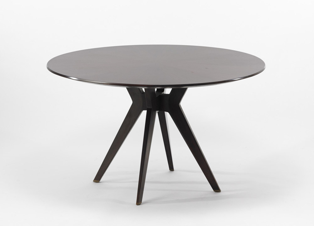 Tavolo tondo impiallacciato in palissandro indiano, puntali in ottone....