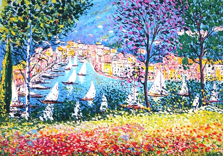 ANTONIO IALENTI Campobasso 12/07/1937  Portofino serigrafia su tela cm. 60x87, esemplare 21/150, firma in basso a destra, pubblicato sulla rivista Arte Mercato numero 5 del maggio 2000.