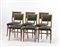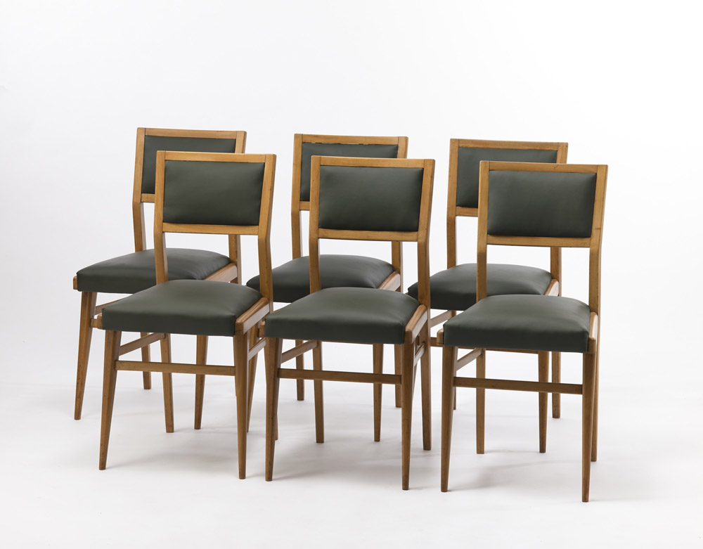 Lotto di sei sedie in faggio. Produzione italiana, anni 50. Sedute e schienali rivestiti in skai verde (lievi difetti)