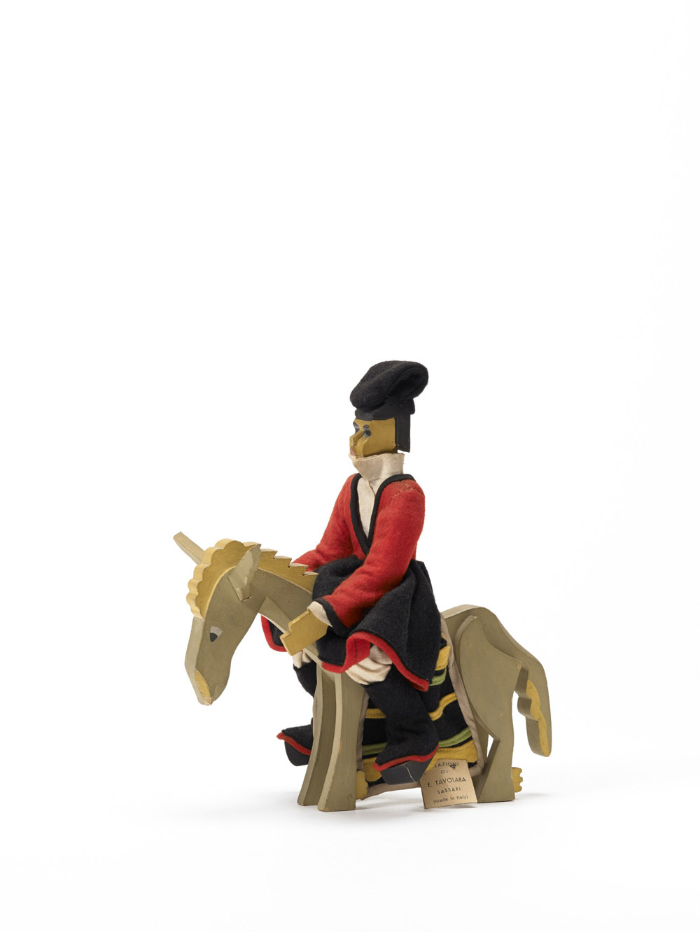 Eugenio Tavolara (1901 - 1963) - Personaggio a dorso d'asino, scultura con corpo in legno decorata in policromia con vesti in feltro e tela. Etichetta cartacea "Creazioni E. Tavolara, Sassari" (h cm 21) Provenienza: Collezione privata Bibliografia: cfr: G. Altea - M. Magnani, Eugenio Tavolara, Edizioni Ilisso, Nuoro 1994