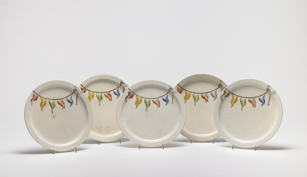 Manifattura Richard-Ginori San Cristoforo - Gruppo di cinque piatti in terraglia smaltata in bianco-crème sotto vetrina, decorati a mano con bandierine marinare. Milano, anni 30. Marcati in verde “Richard Ginori fabbricato in Italia”, con monogramma e numerale "23-7-37". (diam cm 23) (segni d'uso)