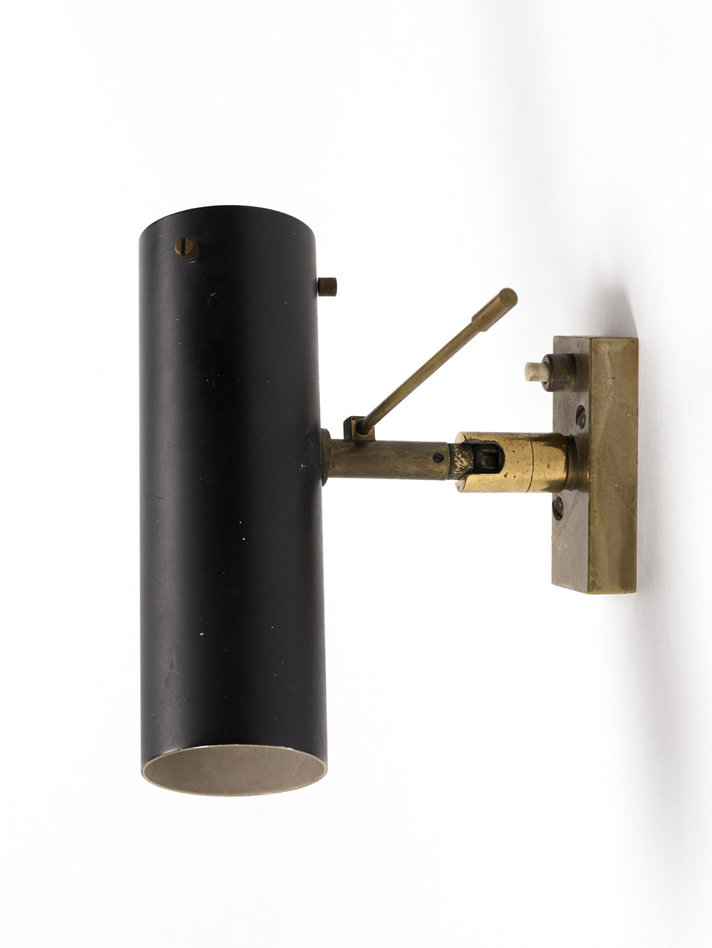 Giuseppe Ostuni - (attribuito) lampada da parete simile al modello "181". probabile produzione O-Luce, Milano, anni 60. Alluminio laccato nero, bianco, ottone (cm 17x17x17) (difetti)
