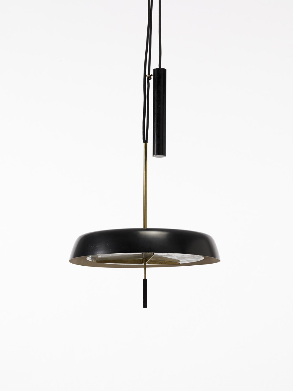 Stilnovo. Lampada a sospensione a saliscendi, Milano anni '60. Alluminio laccato nero, ottone e vetro satinato (d cm 39) (lievi difetti)