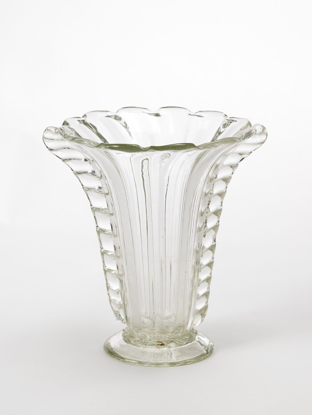 Barovier & Toso (attribuito) Vaso costolato con morise laterali, in vetro incolore di forte spessore. Milano, anni 40 (h cm 31)