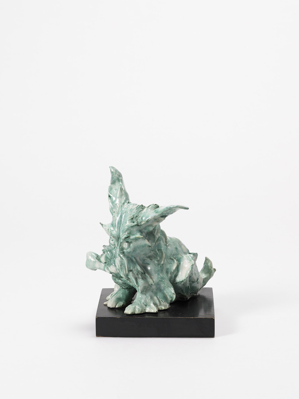 Guido Cacciapuoti (Napoli 1892 - Milano 1953) - Scultura in grès policromo raffigurante Scottish Terrier su base in legno ebanizzato. Produzioni anni 30/40, firmata G. Cacciapuoti. Pubblicata su catalogo del periodo con il numero 974 (h cm 18)(lievissimi difetti)