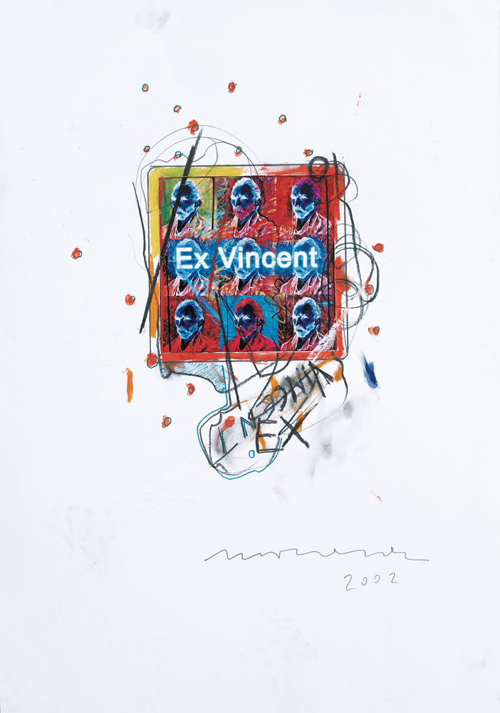 ENRICO MANERA Asmara (Etiopia) 04/04/1947  Ex Vincent, 2002 tecnica mista e collage su carta cm. 100x70, firma e anno in basso, dichiarazione d'autenticità dell'artista e Archivio Enrico Manera a cura della Meeting Art (VC) su foto.