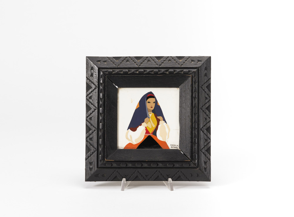 Edina Altara (1898 - 1983) - Mattonella in terracotta dipinta invetriata raffigurante donna in costume sardo, anni 30 (cm 10x10 senza cornice). In cornice ebanizzata Provenienza: Collezione privata
