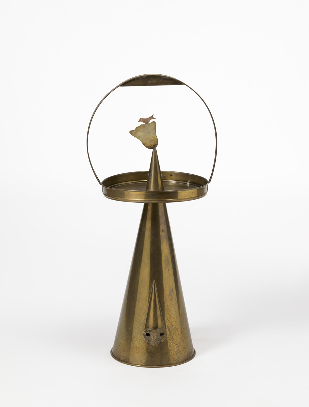 Riccardo Dalisi (1931) - Tavolino da servizio modello "Pulcinella". Produzione Vanini, Italia anni 70. Ottone. (h cm 90, d 35)