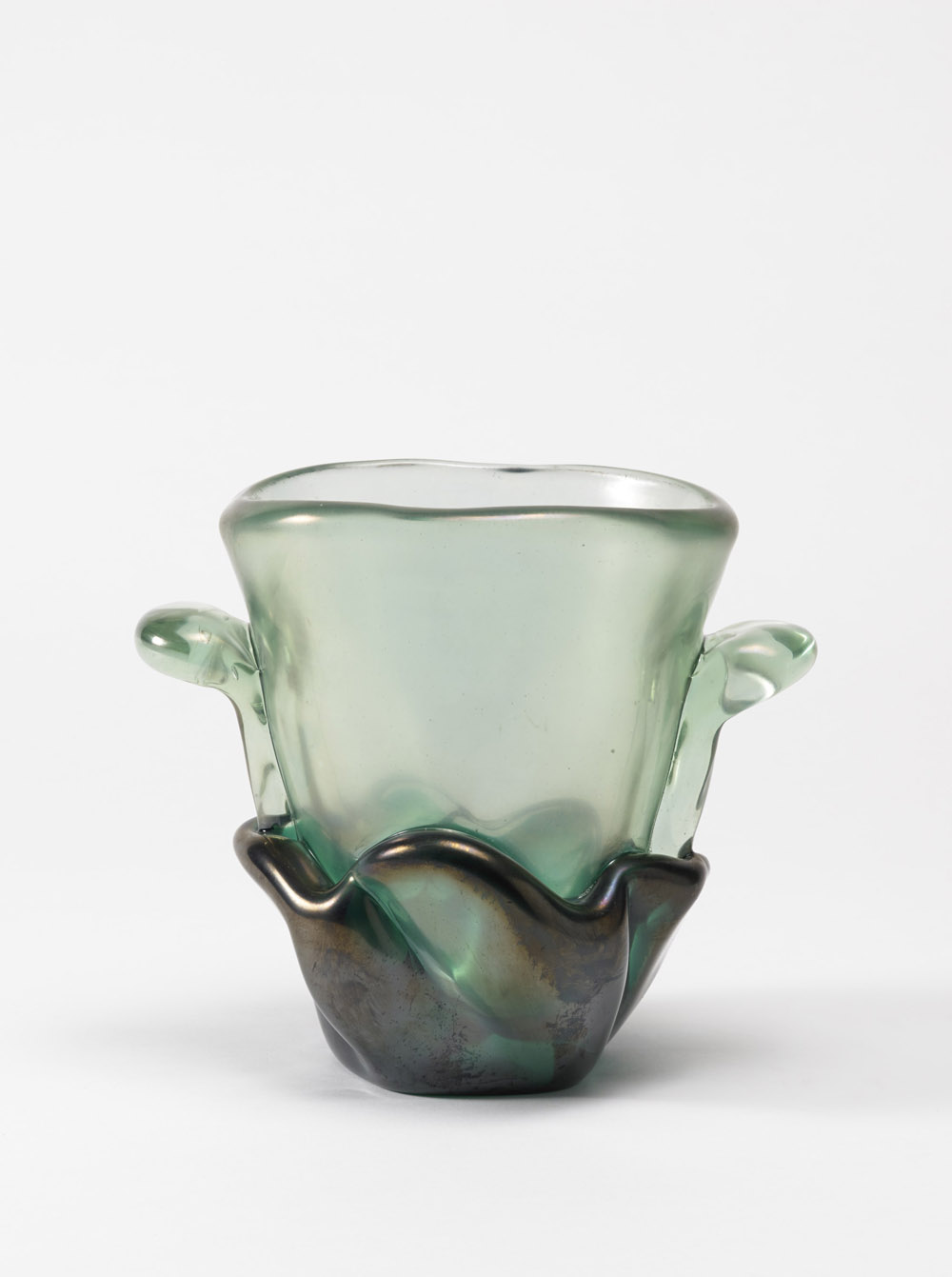 Seguso (attribuito) - Vaso biansato in vetro massello verdino di forte spessore e iridato sulla superficie esterna. Murano, anni 40 (h cm 24)