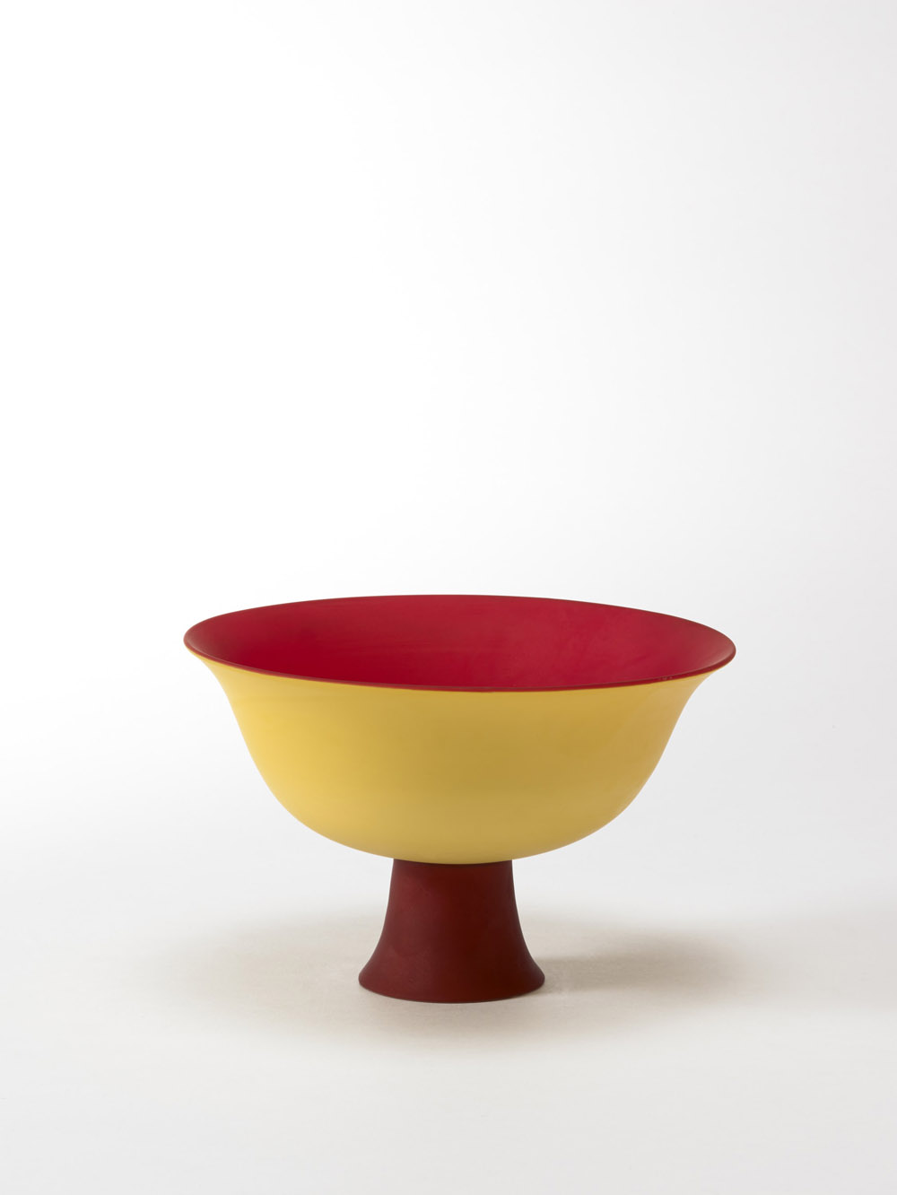 Flavio Poli (1900 - 1984) - (attr.)Coppa in vetro incamiciato satinato giallo e rubino. Disegno simile al n. 12376. Seguso, Murano 1959 ca. (h cm 12,5) Bibliografia: M. Heiremans, Seguso vetri d'Arte. Glass object from Murano (1932-1973), Arnoldsche, Stuttgart 2014, p.150