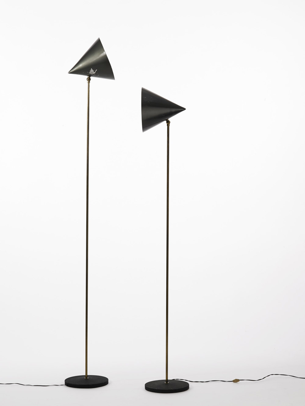 Luigi Caccia Dominioni (1913) - Lotto di due di lampade LTE5 "imbuto". Produzione Azucena, Milano anni 50. Ottone, alluminio verniciato. Paralume snodato (h cm 150 e 134) (difetti e mancanze)