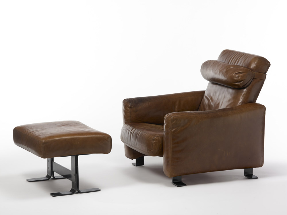 Tobia Scarpa (1935) - Rara poltrona con pouff modello "915". Produzione Cassina, Milano 1965. Struttura in metallo verniciato nero , rivestimento in pelle.