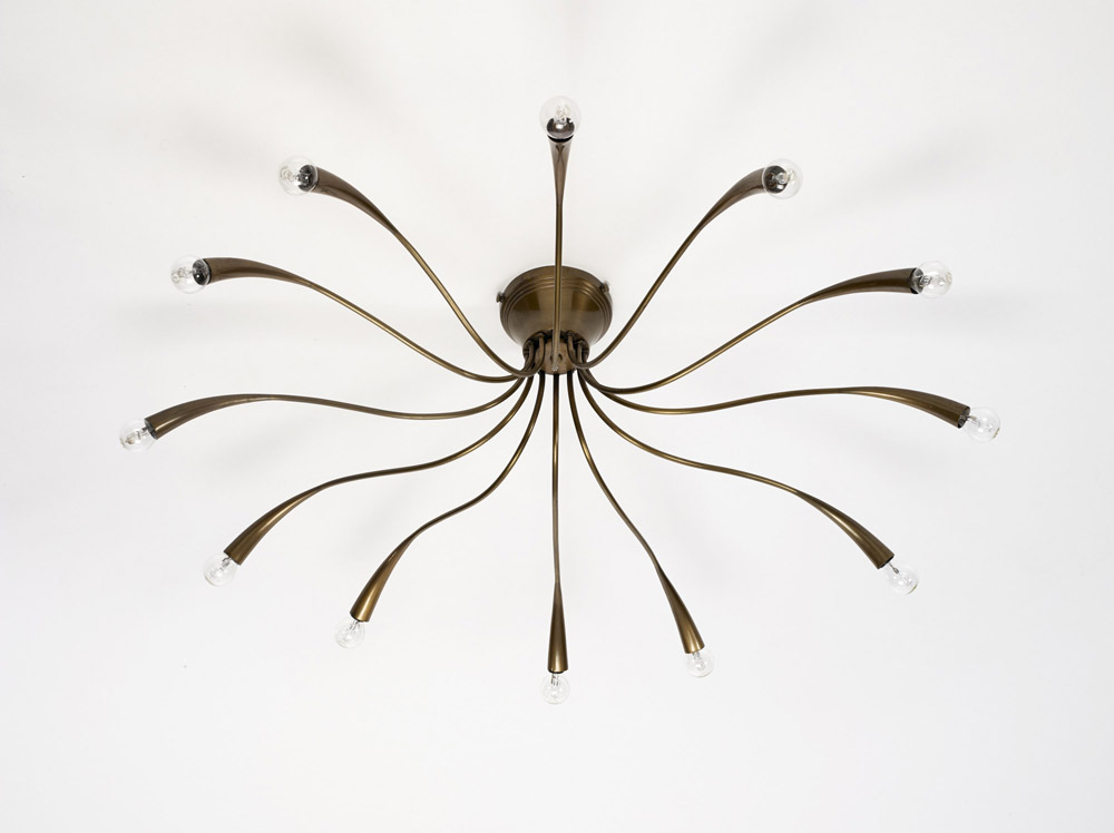 Lampada a plafone a dodici braccia in ottone ossidato. Produzione italiana...
