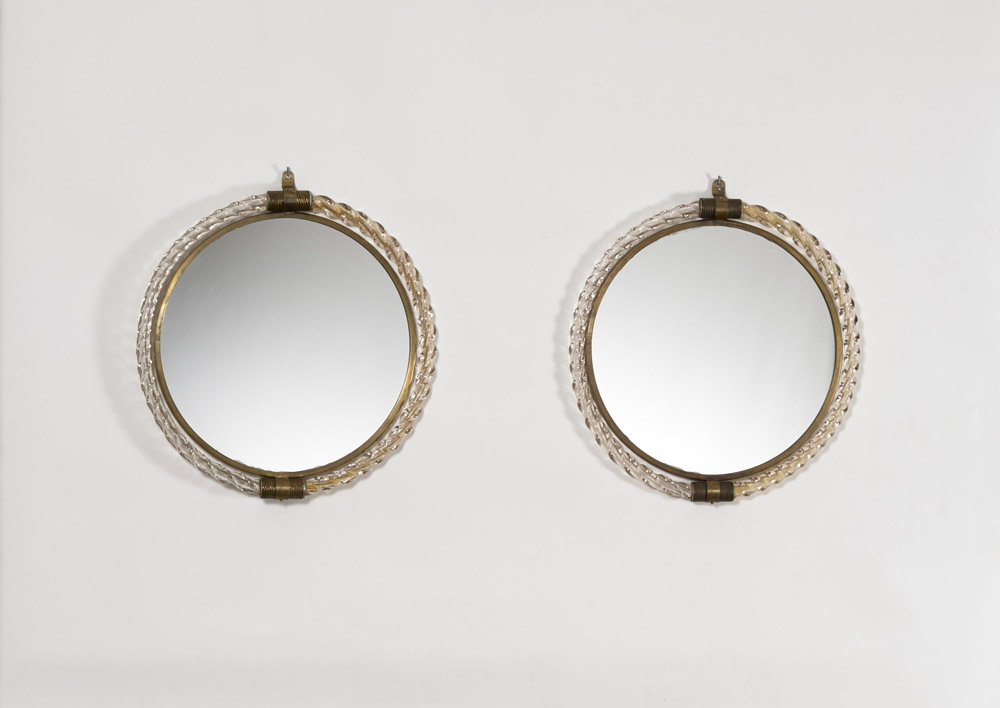 Coppia di specchi in vetro trasparente rosa a torciglione e ottone. Esecuzione italiana anni 20/30 (d. cm 45) (lievi difetti)