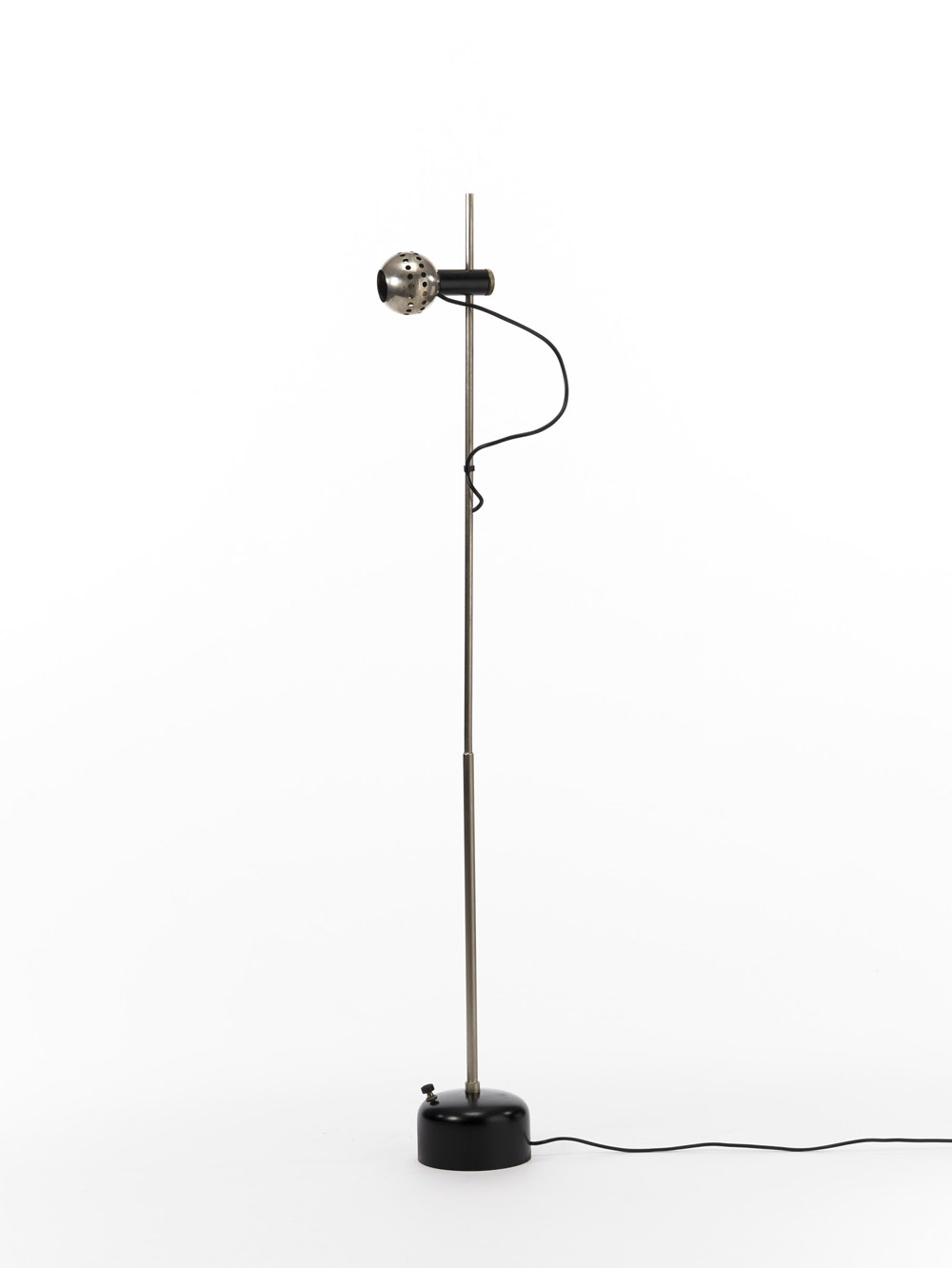 Angelo Lelii (1911 - 1979) - Lampada da terra modello "Vogue". Produzione Arredoluce, 1962 ca. Stelo in ottone nichelato opaco, base in fusione di alluminio verniciato nero, portalampada sferico orientabile retto da magnete. (h cm 140) (lievi difetti) Bibliografia: Catalogo arredoluce anni 60; "Domus", n. 429, agosto 1965, p. d/300
