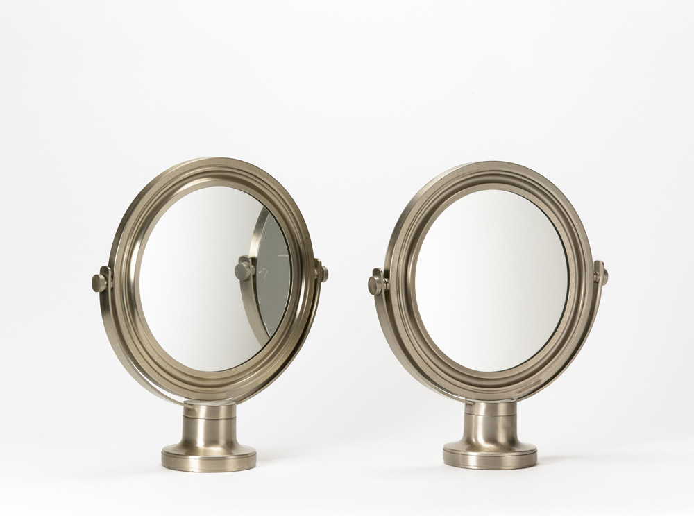Oscar Torlasco - (attribuito) Coppia di specchi da tavolo in ottone nichelato e spazzolato. Italia anni 60. (h cm 54) (mancanze)
