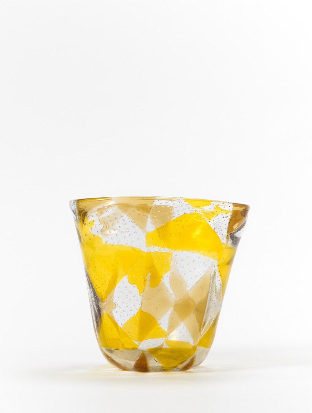 Barovier & Toso. Vaso "intarsio", vetro soffiato a bolle e tessere nei toni del giallo. Murano, 1963 ca. Firmato a punta Barovier & Toso, Murano" (cm h 24)