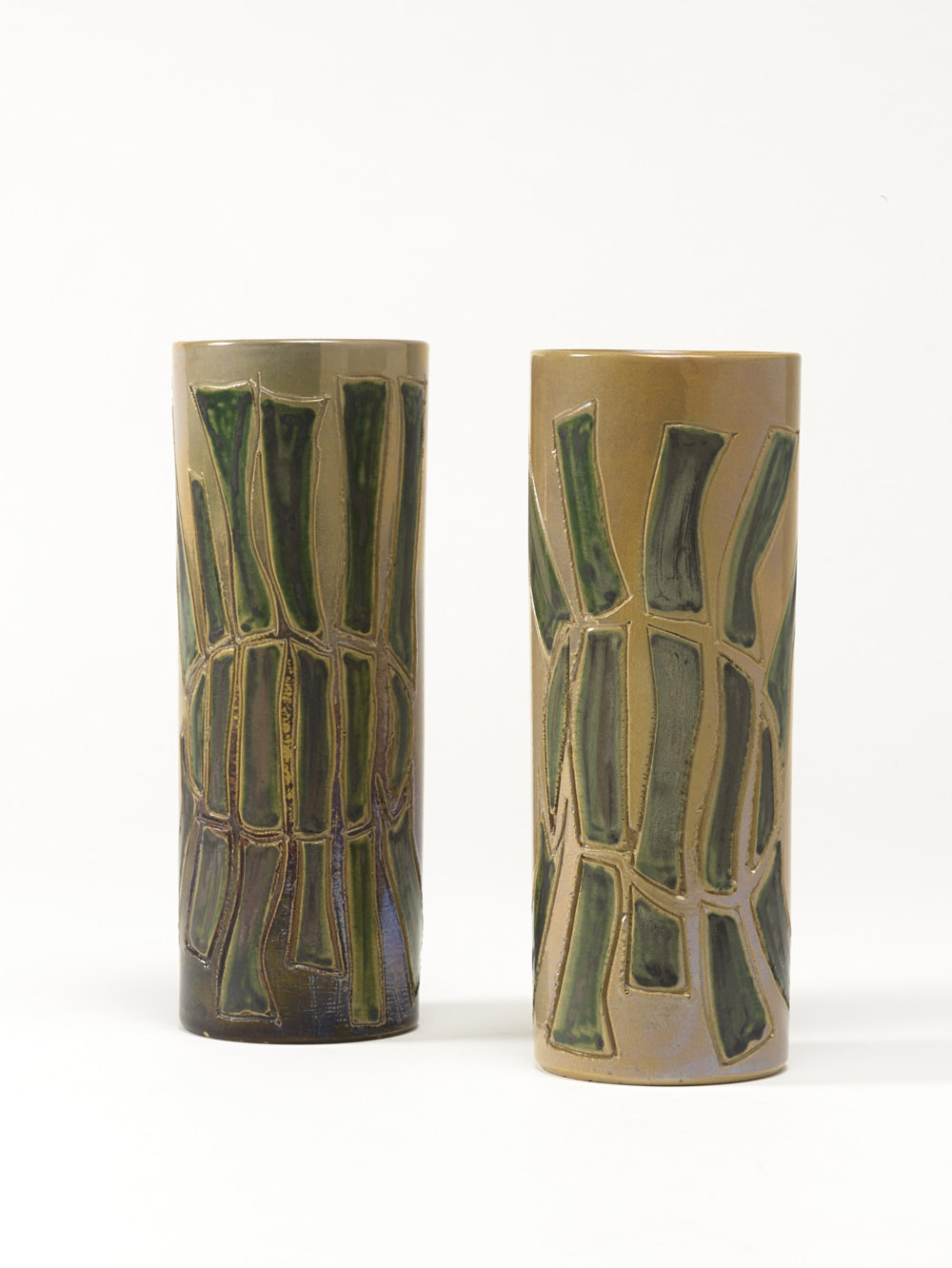 Roberto Crippa (Monza 1921 - Bresso 1972) - "Mon Soleil" Coppia di vasi in ceramica modellata al tornio, smaltata nei toni del rosa, dell'ocra, del verde e a lustro metallico, titolati e firmati a graffito "mon soleil crippa". Manifattura Ce.As Albisola. Marcati in nero sotto la base (h cm 21,5) Opera in corso di certificazione