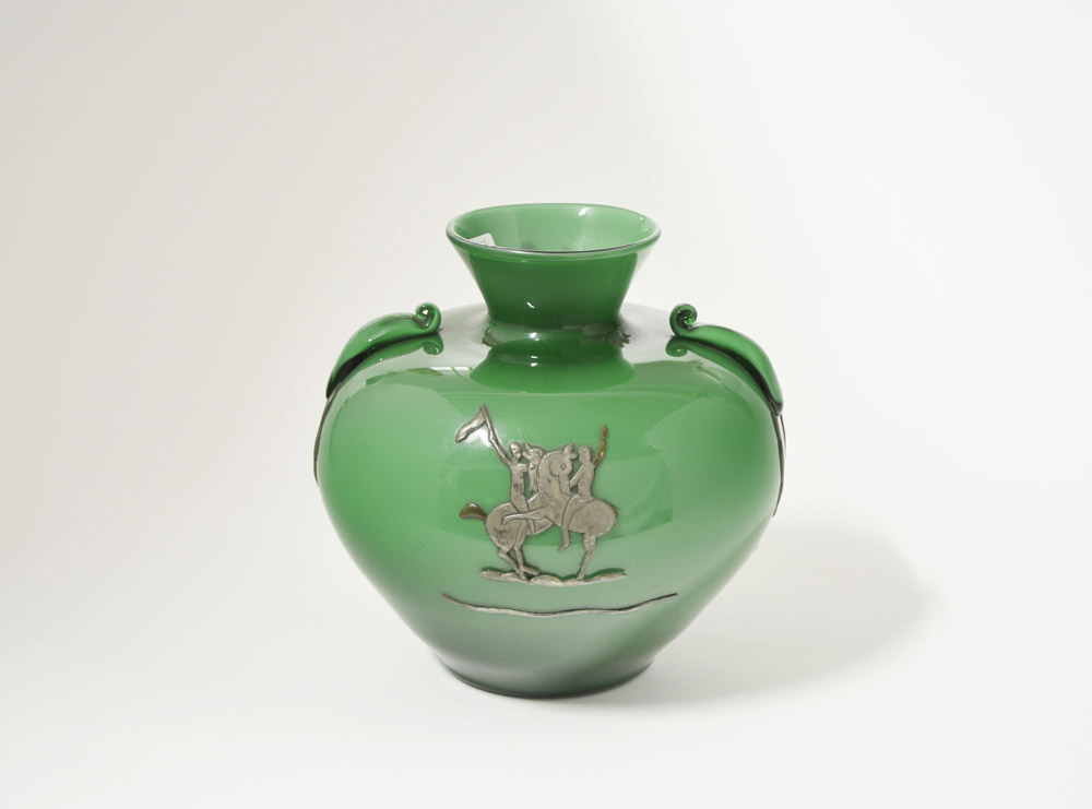 Manifattura di Murano - vaso a collo svasato in vetro incamiciato in vetro soffiato lattimo e verde trasparente, con due anse a ricciolo e applicazioni in fusione metallica raffigurante scene di battaglia. Fine anni 20. (h cm 22) (difetti alle applicazioni metalliche)