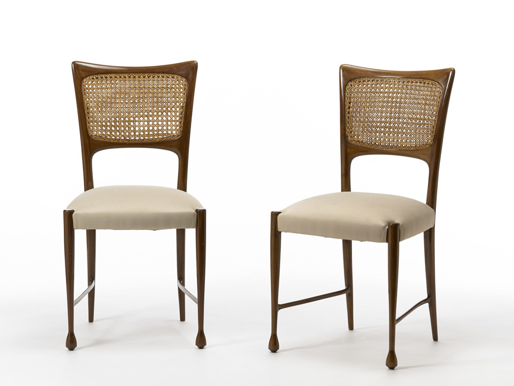 Paolo Buffa (Milano 1903 - 1970) - Coppia di sedie in mogano con schienale incannato e seduta imbottita rivestita in tessuto crème. Esecuzione Marelli & Colico, Cantù, 1954 (cm 46x91x43) Bibliografia: R. Rizzi, M. Marelli, N. Novati, I mobili di Paolo Buffa, Galleria del Design e dell'Arredamento, Cantù 2001, p. 60.