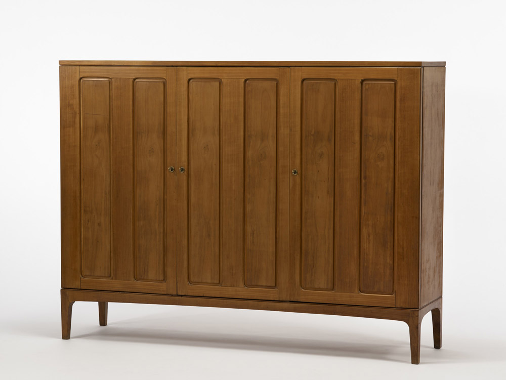 Paolo Buffa (Milano 1903 - 1970) - Mobile contenitore a tre ante in legno massello e impiallacciato in cigliegio. Interno a ripiani e cassetti. Esecuzione Serafino Arrighi, Cantù, 1949 (cm 179x136x45) Bibliografia: R. Aloi, L’arredamento moderno V serie, Hoepli, Milano 1952, tav. 417; R. Aloi, Esempi di arredamento moderno di tutto il mondo. Sale di soggiorno - camini, Hoepli, Milano 1952, tav. 152.