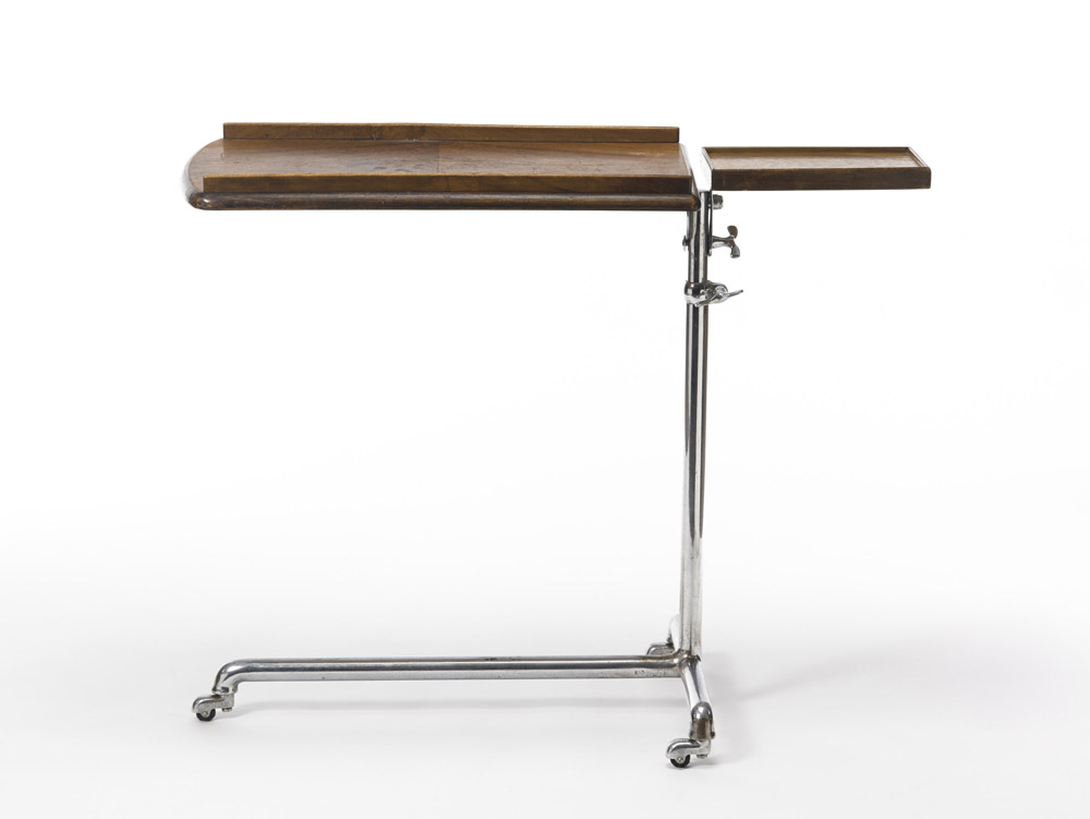 Leggio/tavolino regolabile e snodato, con struttura in tubo metallico saldato e cromato e piani in legno di noce. Produzione Cova, Milano 1950 ca (cm 103x73-117x40) Bibliografia: Il design italiano degli anni ’50 a cura del Centro Kappa, RDE, Milano 1985, p. 59.
