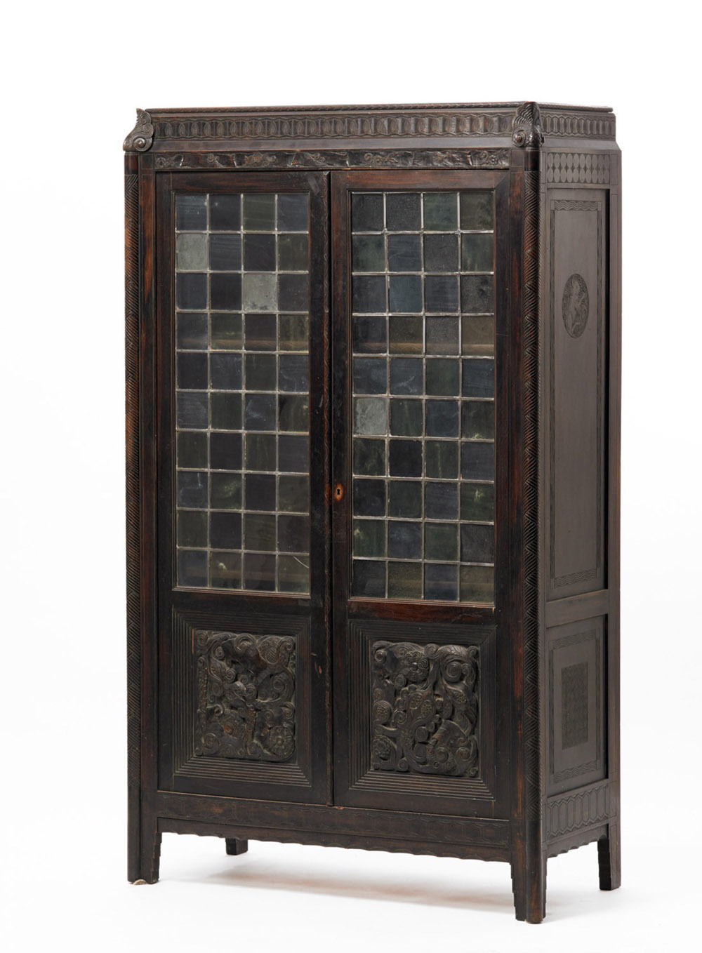 Ettore Zaccari (1877 - 1922) - Mobile a due ante vetrate e ripiani in legno massello finemente intagliato con motivi geometrici e fitomorfi affini al gusto delle Wiener Werkstätte e delle Arts and Crafts. Pannelli frontali intagliati a bassorilievo con scene raffiguranti motivi vegetali geometrizzati. Milano, inizi del sec XX. (cm 88x150x41) (lievi difetti) Bibliografia per mobili simili: G. Marangoni, Enciclopedia delle moderne arti decorative italiane, Ceschina Milano, 1925, vol. 1 Il mobile contemporaneo, tavv. 4, 5, 31, 79, 80, 81, 99.