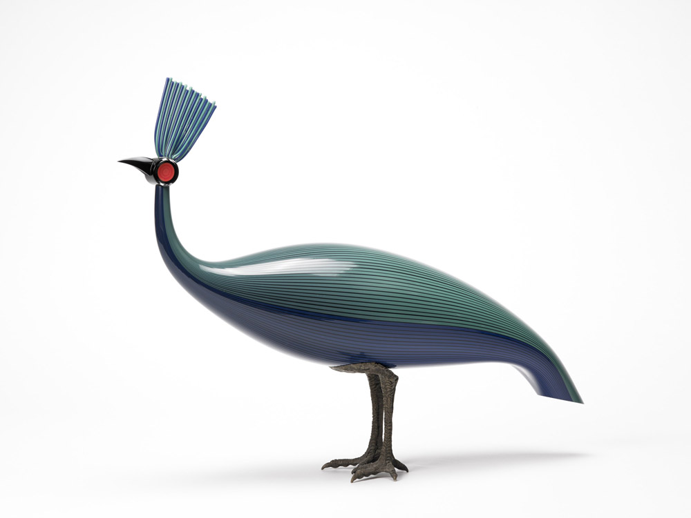 Mario Ticcò - Pavone. Manifattura Veart, Murano 1982. Vetro soffiato a canne nere-turchese e nere-blu, piedi applicati in bronzo. (h cm 50 x 65). Presente restauro alla cresta