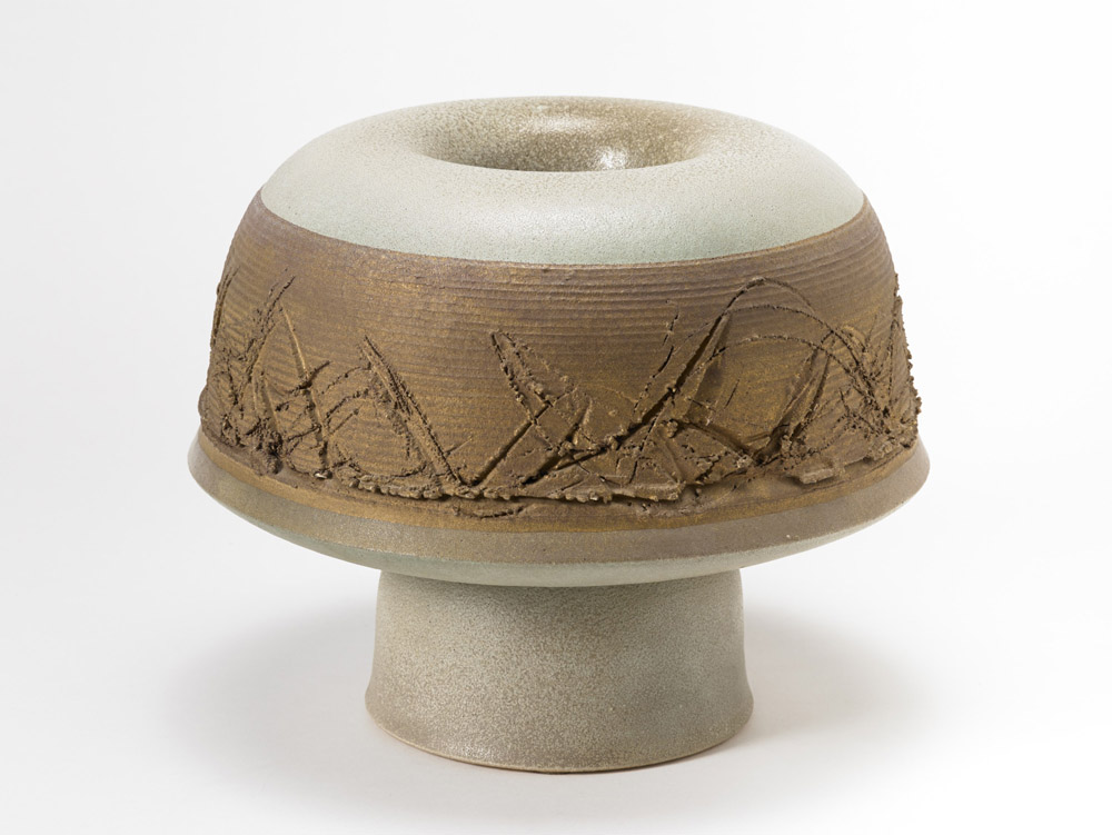 Carlo Zauli (1926 - 2002) - Vaso in grès lavorato al tornio e graffito, smaltato in verde opaco e bronzo.Faenza anni 60 ca. Firmato "Zauli" sotto la base. (d cm 30x26) (lievissime cadute di materia dalla fascia graffita)