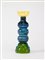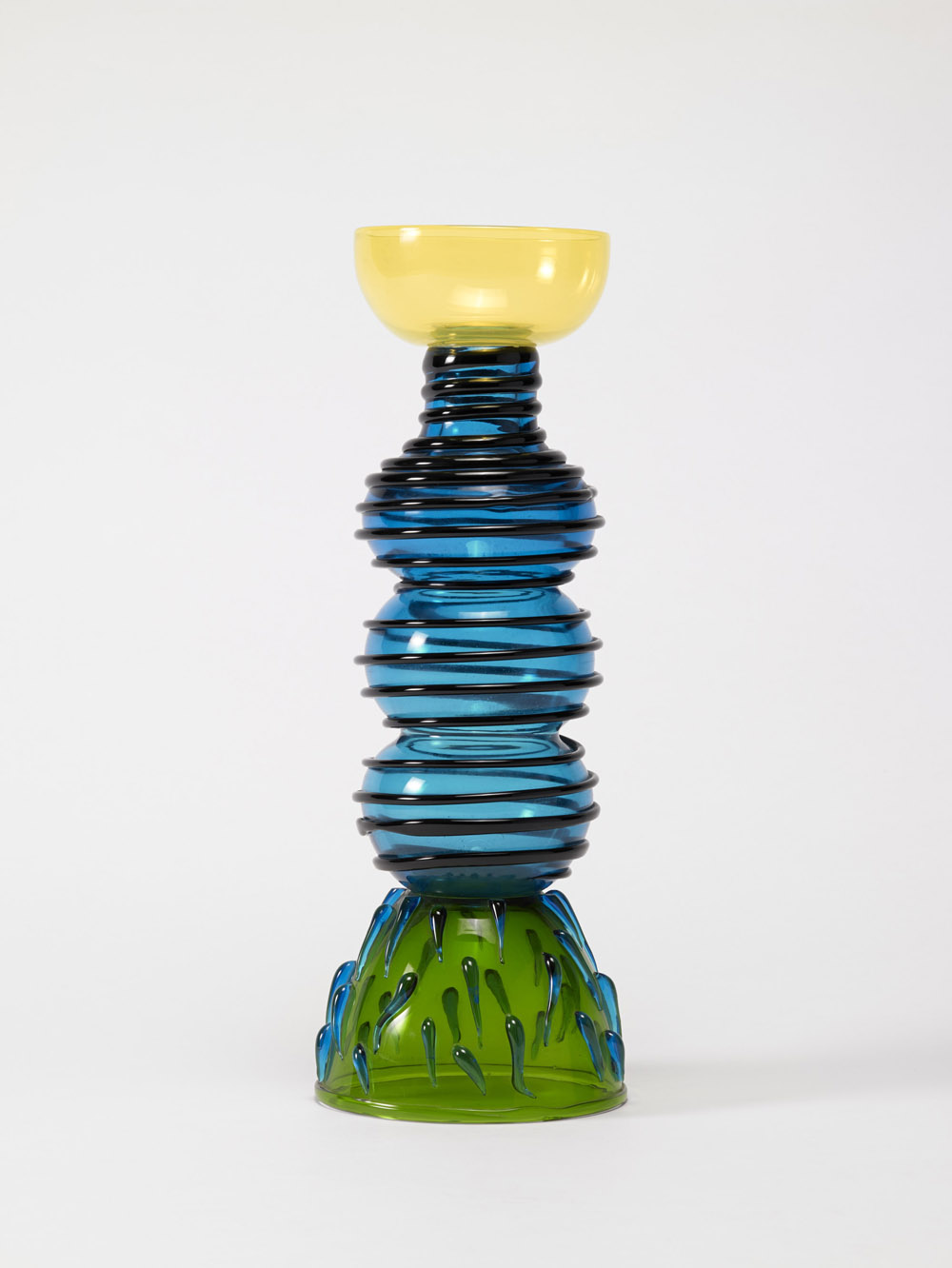 Ettore Sottsass (Innsbruck 1917 - Milano 2007) - Vaso "Alioth", manifattura Toso vetri d'arte per Memphis Milano, 1983. Vetro soffiato trasparente con applicazioni in pasta vitrea e vetro trasparente. Colori verde, azzurro, giallo e nero. Firmato a punta alla base. (h cm 45,5)