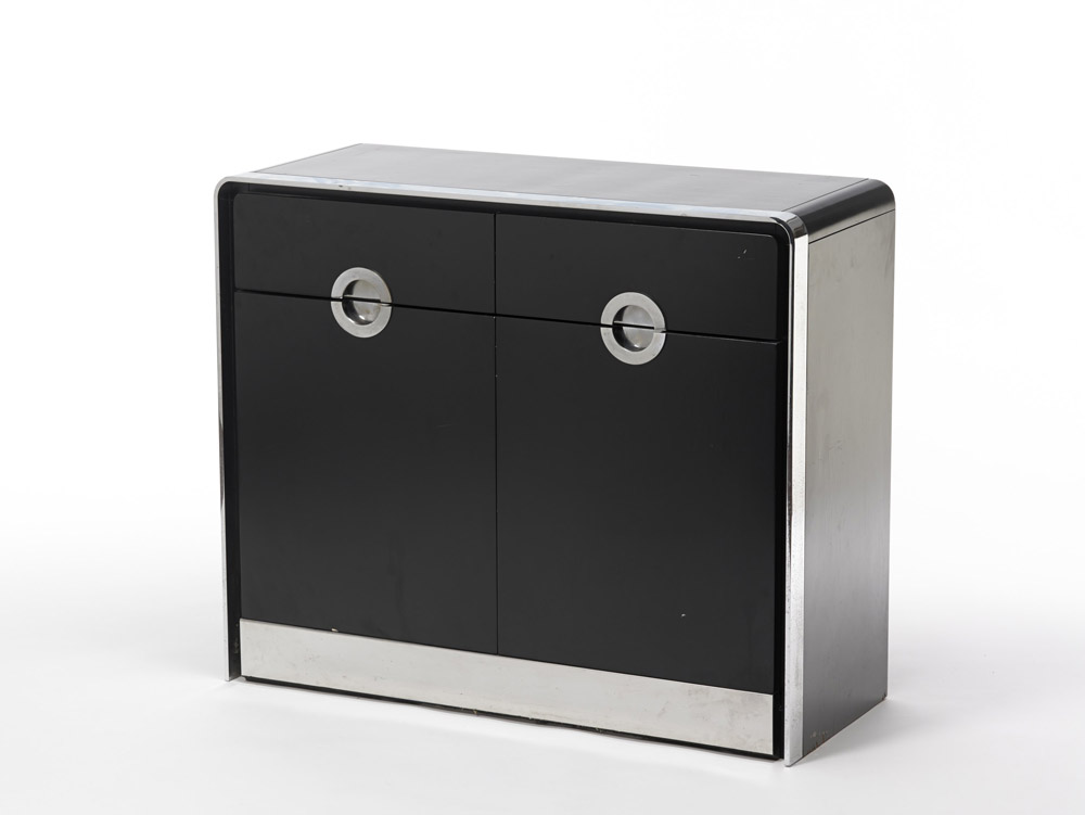 Willy Rizzo (1928 - 2013) - Mobile a due ante e due cassetti modello "Alveo". Produzione Mario Sabot, Italia 1973 ca. Legno laccato nero e acciaio cromato (cm 90x76x36) (difetti)
