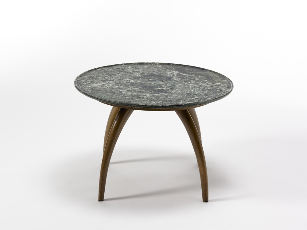 Tavolino da salotto con piano circolare in marmo verde venato e struttura a quattro gambe inflesse in noce chiaro. Esecuzione italiana anni 40. (d cm 68, h cm 47)