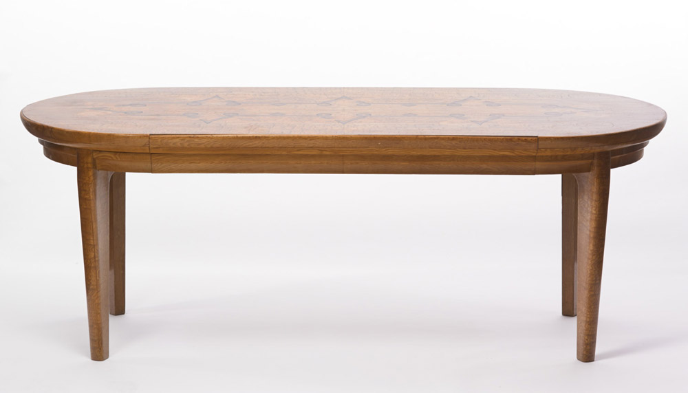 Tavolo da pranzo in legno con piano impiallacciato in radica, intarsiato con...