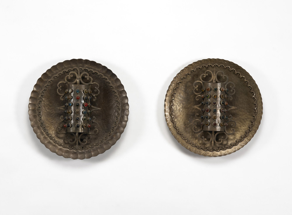 Coppia di lampade da parete in lamina di ferro sbalzata e patinata, con inserti cabochon in vetro colorato e ghirlanda in ferro battuto. Manifattura del nord Italia (h cm 40 ca) (restauri) Provenienza: vano scale di uno dei "grattanuvole" di Piazza Piemonte a Milano (restauri)