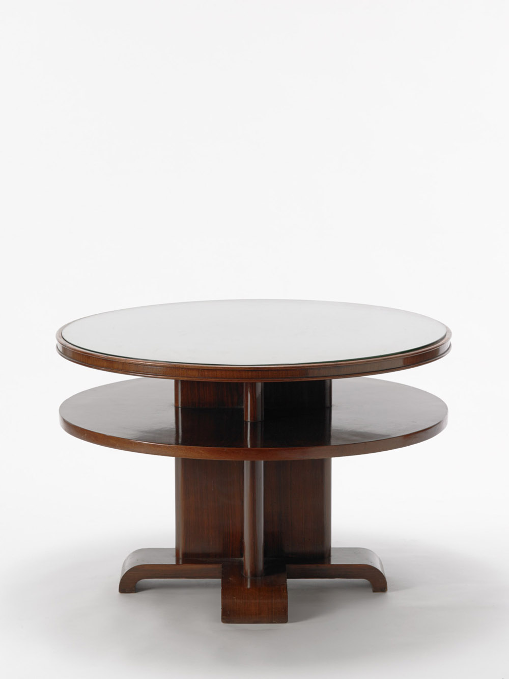 Tavolino da salotto circolare in legno a due ripiani. Esecuzione italiana, anni 30 (diam cm 90x60) Provenienza: Villa Comi Bianchi, Como