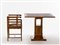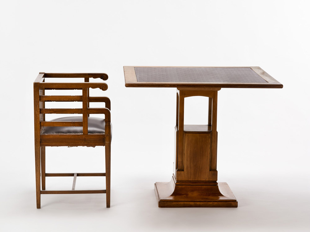 Tavolo da studio con piano quadrato e gamba centrale, en suite con una sedia a braccioli in legno intagliato. Fine del XIX - inizio del XX secolo (cm 90x78x90) Provenienza: Villa Comi Bianchi, Como