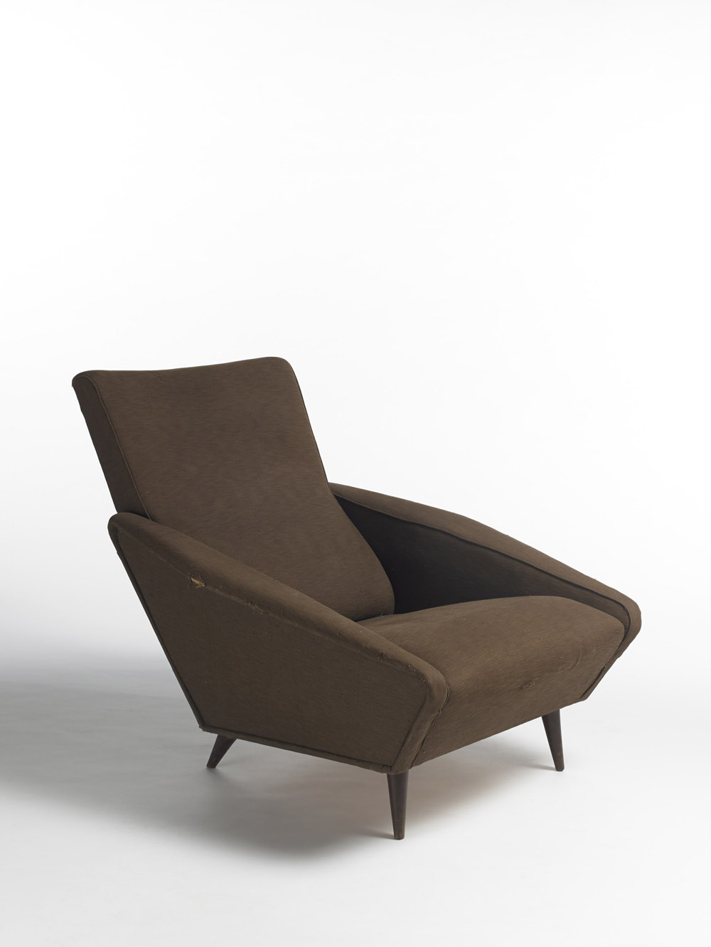 Gio Ponti (Milano 1891 - 1979) - Poltrona modello "807a - distex" 1953. Produzione Cassina, Milano 1953, presentata alla X Triennale di Milano del 1954. Versione con fianchi chiusi, piedi e struttura in legno imbottitura rivestita in tessuto marrone. (cm 78x72x100) (difetti d'uso) Bibliografia: "Domus", n. 289, dicembre 1953, p. 53; "Domus", n. 294, maggio 1954, réclame; R. Aloi, L'arredamento moderno " sesta serie, Hoepli, Milano 1955, tav. 283; "Domus", n. 314, agosto 1956, p. 21; "Rivista dell’arredamento", n. 35, novembre 1957, p. 29; P. C. Santini, Gli anni del design italiano. Ritratto di Cesare Cassina, Electa, Milano 1981, pp. 108, 114; Centrokappa, Il design italiano degli anni ’50, Ricerche Design editrice, Milano 1985, p. 128; L. Licitra Ponti, Gio Ponti. L’opera, Leonardo, Milano 1990, p. 160; I. De Guttry, M. P. Maino, Il mobile italiano degli anni '40 e '50, Laterza, Bari 1992, p. 241; L. Falconi, Gio Ponti oggetti interni disegni 1920-1976, Electa, Milano 2005, pp. 172, 248; F. Irace, Gio Ponti a Stoccolma. L’Istituto Italiano di Cultura "C. M. Lerici", Electa, Milano 2007, p. 74; G. Busone, Made in Cassina, Skira, Milano 2008, p. 153.