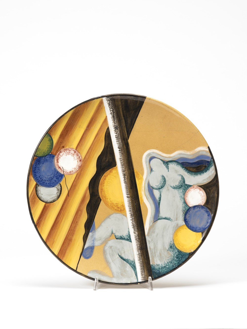 Tullio d'Albisola (Albissola (SV) 1899 - 1971) - Raro piatto futurista in maiolica decorata a mano in policromia e sotto vetrina. Manifattura MGA, Albisola, fine anni 20 ca. Firmato sotto la base "Tullio MGA"(d cm 37) (restauro conservativo)