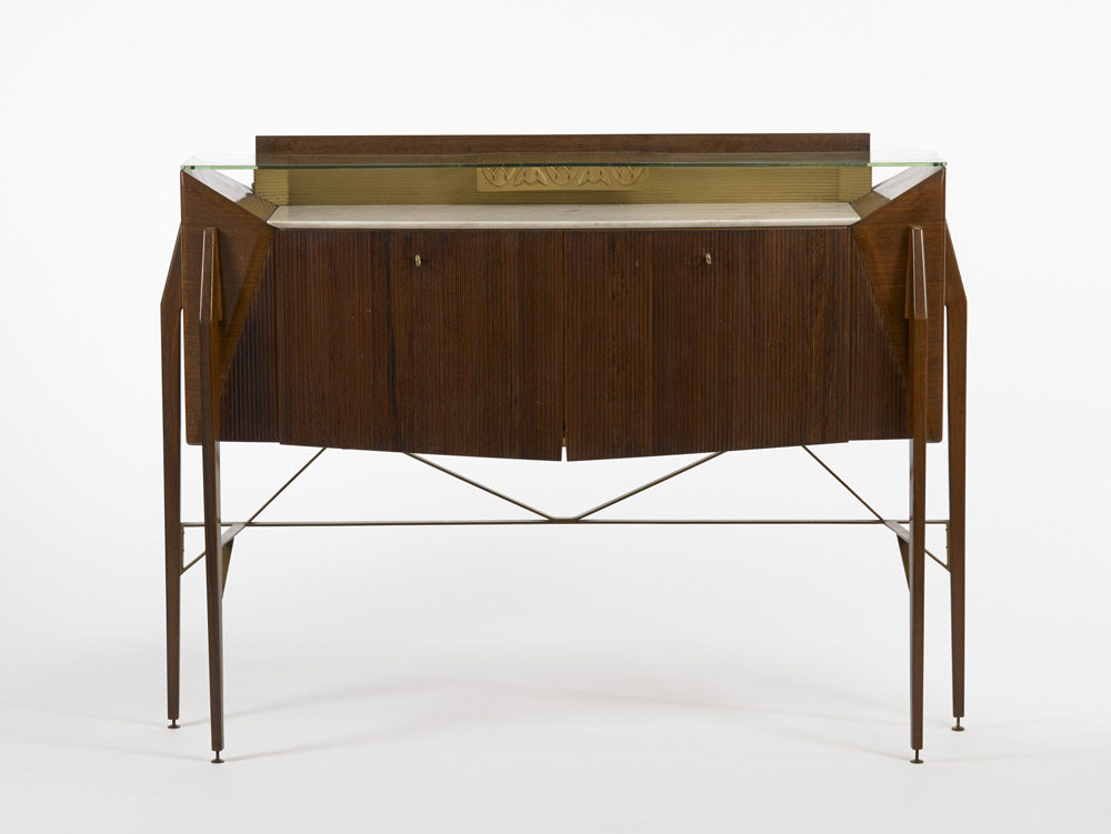 Raro mobile bar a due ante con struttura a montanti di palissandro indiano massello e correnti in metallo dorato, corpo lastronato a scanalature verticali e impiallacciato. Doppio ripiano a giorno in marmo bianco e cristallo di forte spessore. Interni in acero, laminato e cristallo. Esecuzione Consorzio Esposizione Mobili Cantù, anni 50 (cm 173x134x38) (lievi difetti)