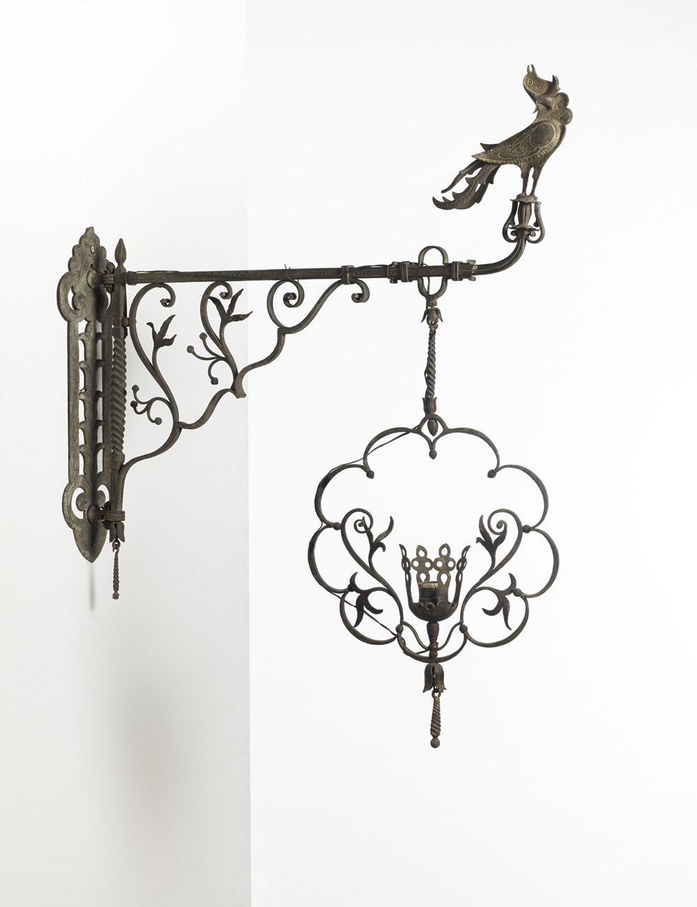 Carlo Rizzarda (1883 - 1931) - Lampada a parete in ferro battuto lavorato a torcilione e sagomato in foggia di racemi vegetali, coronato da figura di gallo. Milano, 1925 ca. (h cm 55 ca.)
