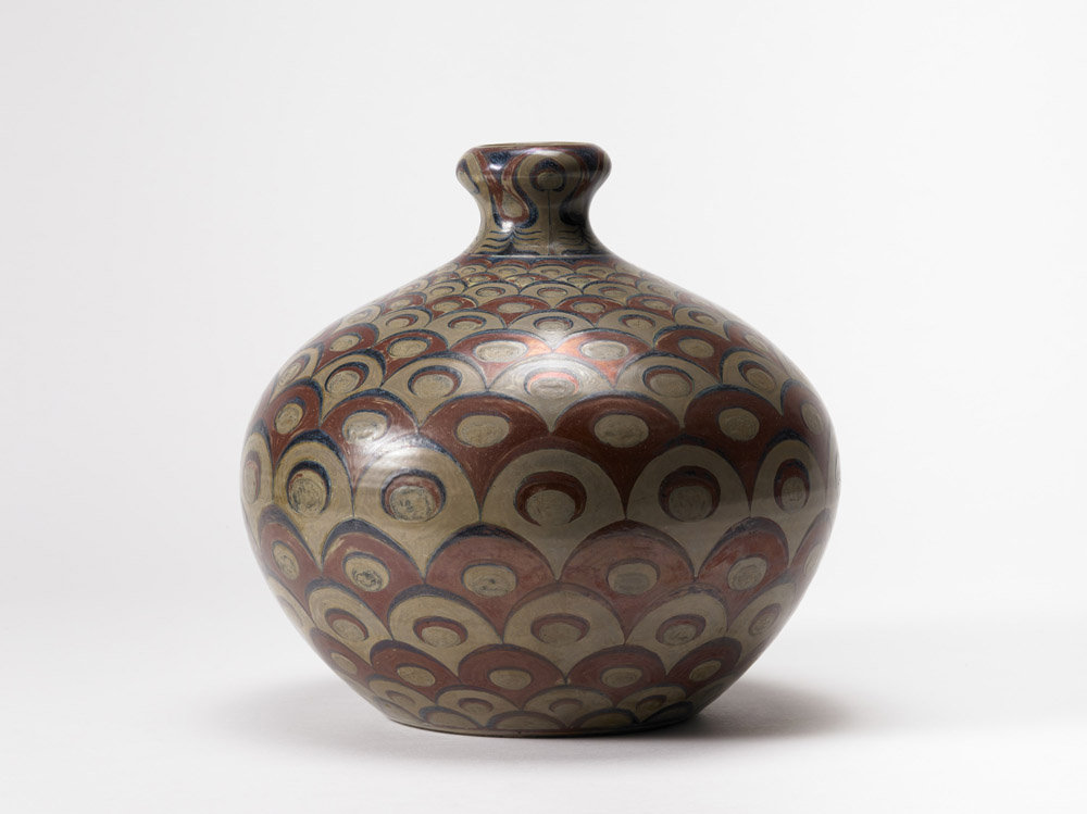 Galileo Chini (Firenze 1873 - 1956) - Grande vaso in ceramica formata al tornio e decorata a smalti policromi nei toni rosso bruno, beige, blu e a leggero lustro metallico, con figurazioni geometriche astratte. Manifattura Arte della Ceramica Firenze, 1902 ca. Firmato sotto la base in blu "ADCF Firenze" con il monogramma del melograno, la lettera "M" e con i numerali "223" in blu e "27.21.37" in nero(h cm 30)